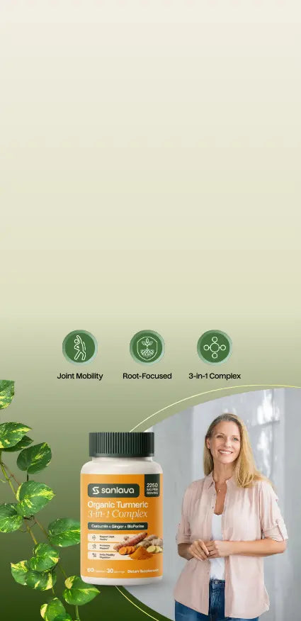 Sanlava Turmeric Organic 3-in-1 Complex helps ease stiffness, support smooth movement, and restore natural energy. To feel active and independent every day.