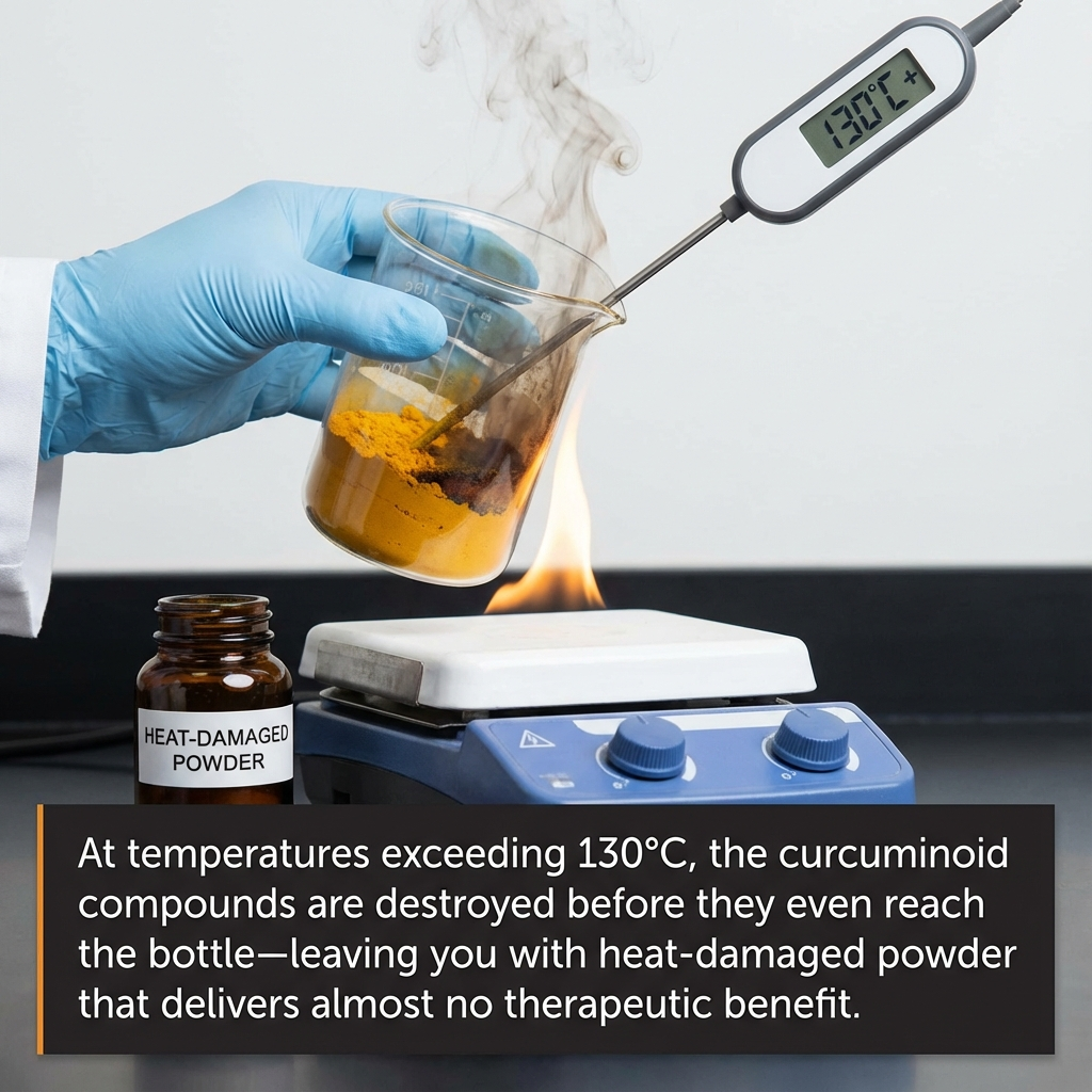 At temperatures exceeding 266 °F, the curcuminoid compounds are destroyed before they even reach the bottle, leaving you with heat-damaged powder that delivers almost no therapeutic benefit.